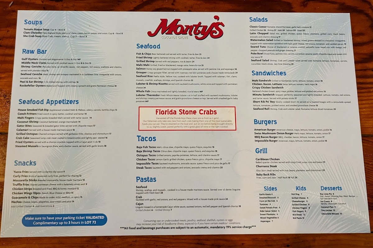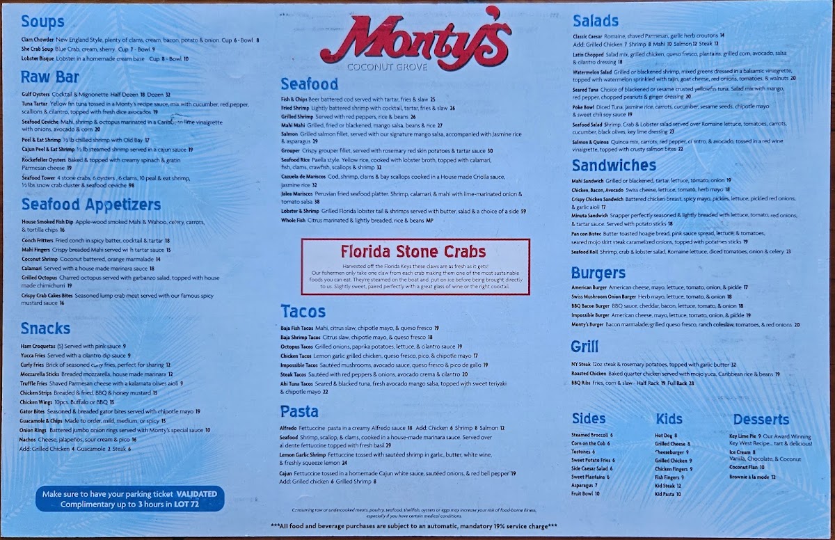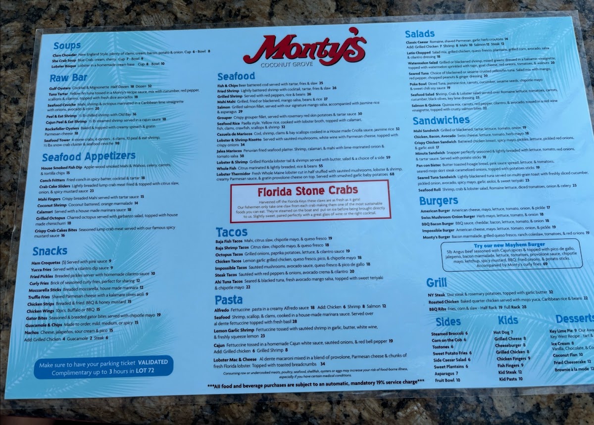 Monty's Coconut Grove Menu